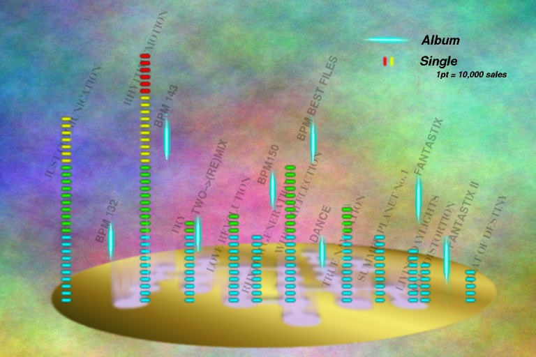 図は TWO-MIX の CD ごとの販売枚数の合計をまとめたものです (刻々と増えるものですから目安程度に考えてください)。 RHYTHM EMOTIONで30万枚を超えたのですが、 その後が続かず Single は 10 万枚前後、Album で 20 万枚というレベルを漂っています。
